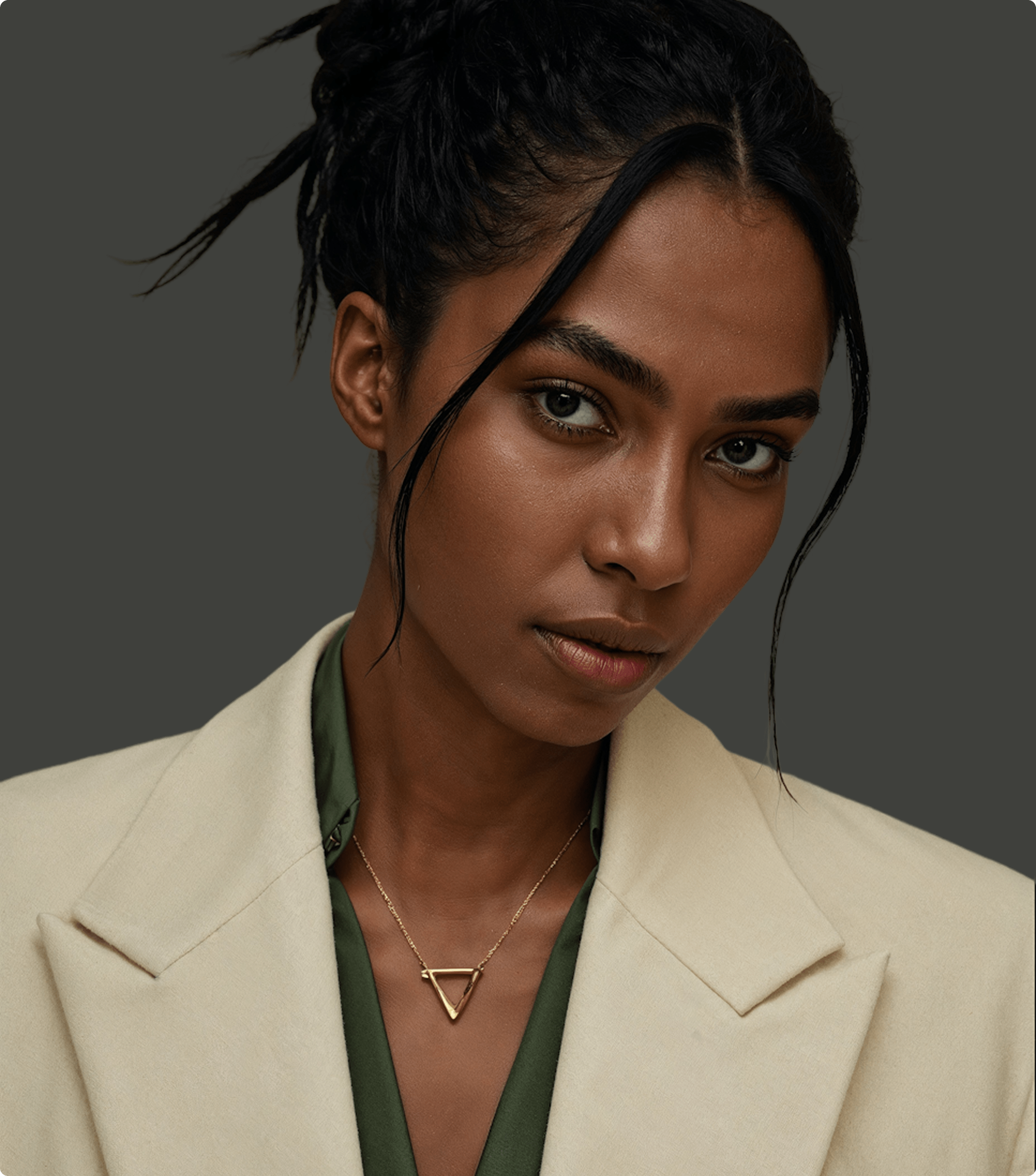 Portrait of a woman with dark braided hair wearing a beige blazer, green blouse, and a gold triangle pendant necklace.