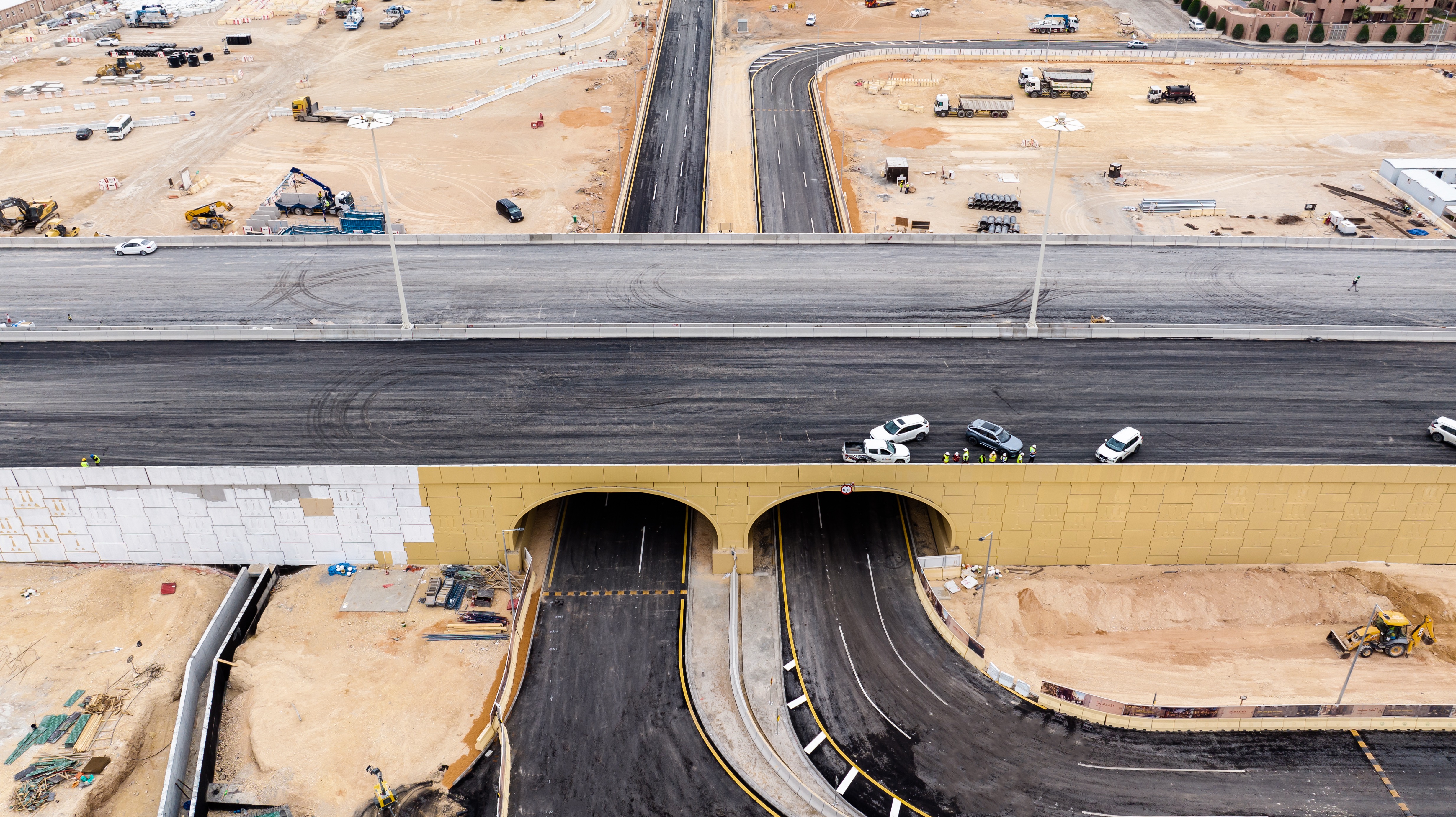 More than a quarter million cubic meters of material was imported and placed in just two months to accelerate the realignment. The team built both 46-meter underpasses in only 45 days, maintaining zero Lost Time Incidents over 1.3 million man-hours. Traffic on King Khaled Road was kept flowing using four well-coordinated detour phases throughout construction.